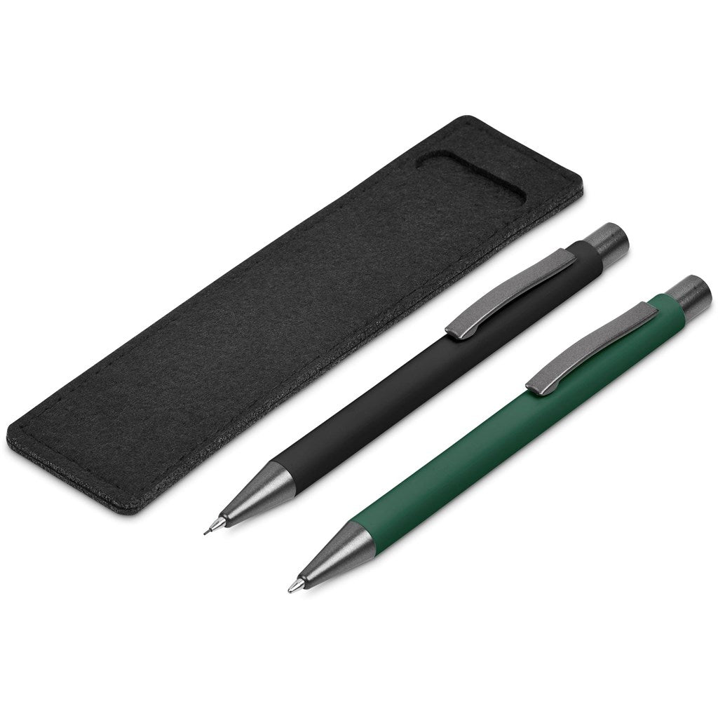 A black metal pencil and a metal pen in a choice of colours are paired together in a black pouch made from RPET felt. Laser engraving on the rubberised finish barrel of the pen and the pencil provides a clean precise effect which is both subtle and visible. The ball pen refill contains good quality, black German ink and will provide smooth, uninterrupted writing for a minimum of 1,500 metres. The pencil is fitted with break-resistant 0.5mm lead. A set with a different colour pen and pencil makes it easier to instantly identify which is the pen and which is the pencil.