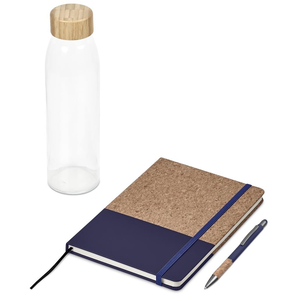 A glass bottle with a bamboo lid, a notebook with a partial cork cover, and a ball pen with a cork grip are neatly presented together in a gift box. This set is suitable as a client gift, or for staff and onboarding of new members to the team. A pre-packaged gift set not only looks impressive, but can also be a convenient and practical option when it comes to transport and delivery. The box is 27 ( l ) x 23 ( w ) x 7.5 ( h ) cm, and is made from natural kraft board.