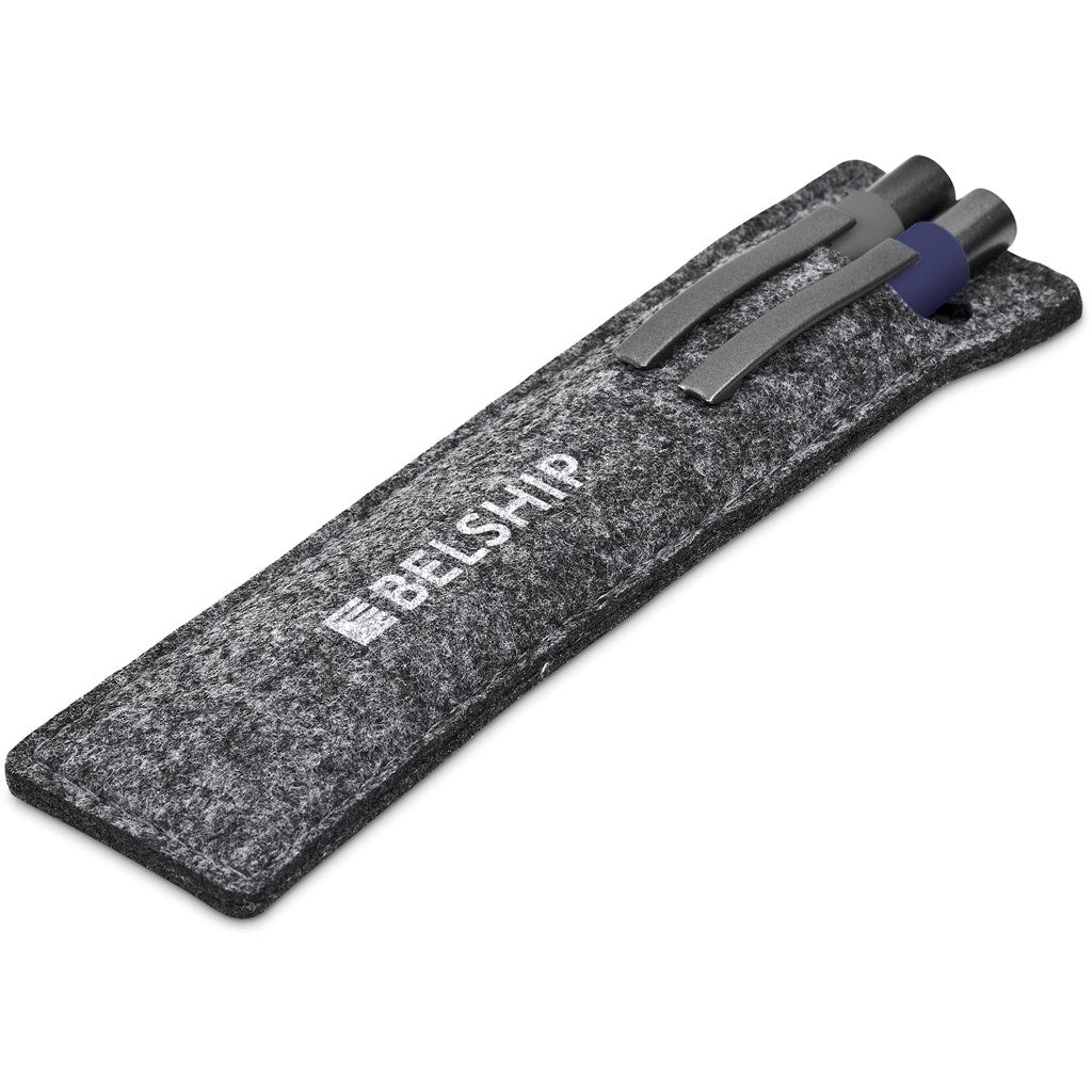 A grey metal pencil and a metal pen in a choice of colours are paired together in a grey pouch made from RPET felt. Laser engraving on the rubberised finish barrel of the pen and the pencil provides a clean precise effect which is both subtle and visible. The ball pen refill contains good quality, black German ink and will provide smooth, uninterrupted writing for a minimum of 1,500 metres. The pencil is fitted with break-resistant 0.5mm lead. A set with a different colour pen and pencil makes it easier to instantly identify which is the pen and which is the pencil.